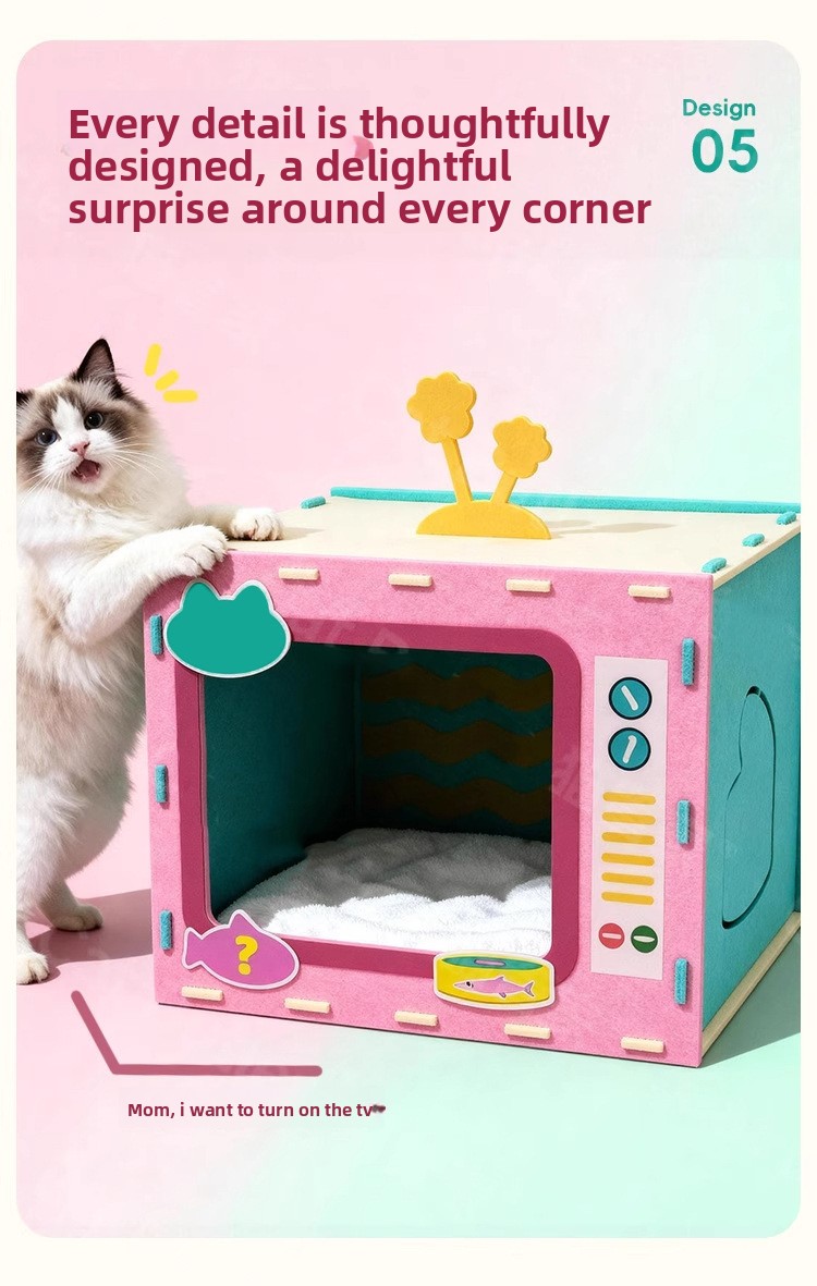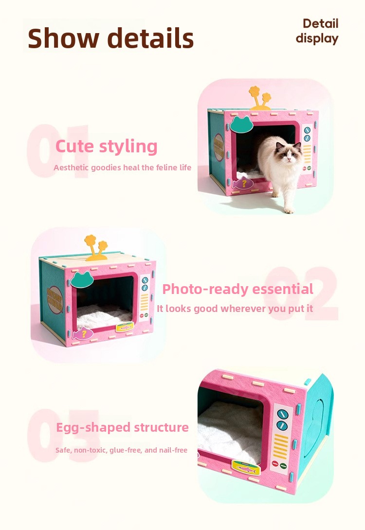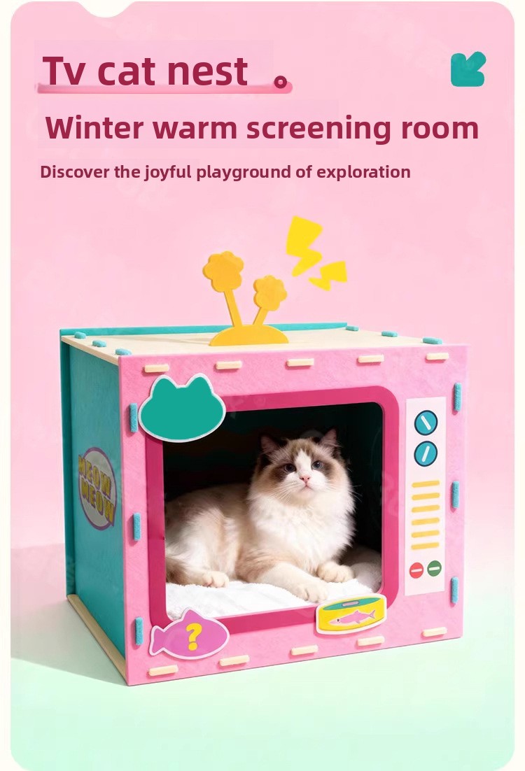 Overview Warmth: Thickened felt material provides excellent insulation for cats in cold weather. Security: Semi-enclosed design creates a cozy, safe space that reduces pet anxiety. Playful Design: TV carton appearance adds fun and encourages pet interaction. Versatile Use: Suitable for indoor resting, sleeping, and playful hiding. Â Specifications Material: Felt...